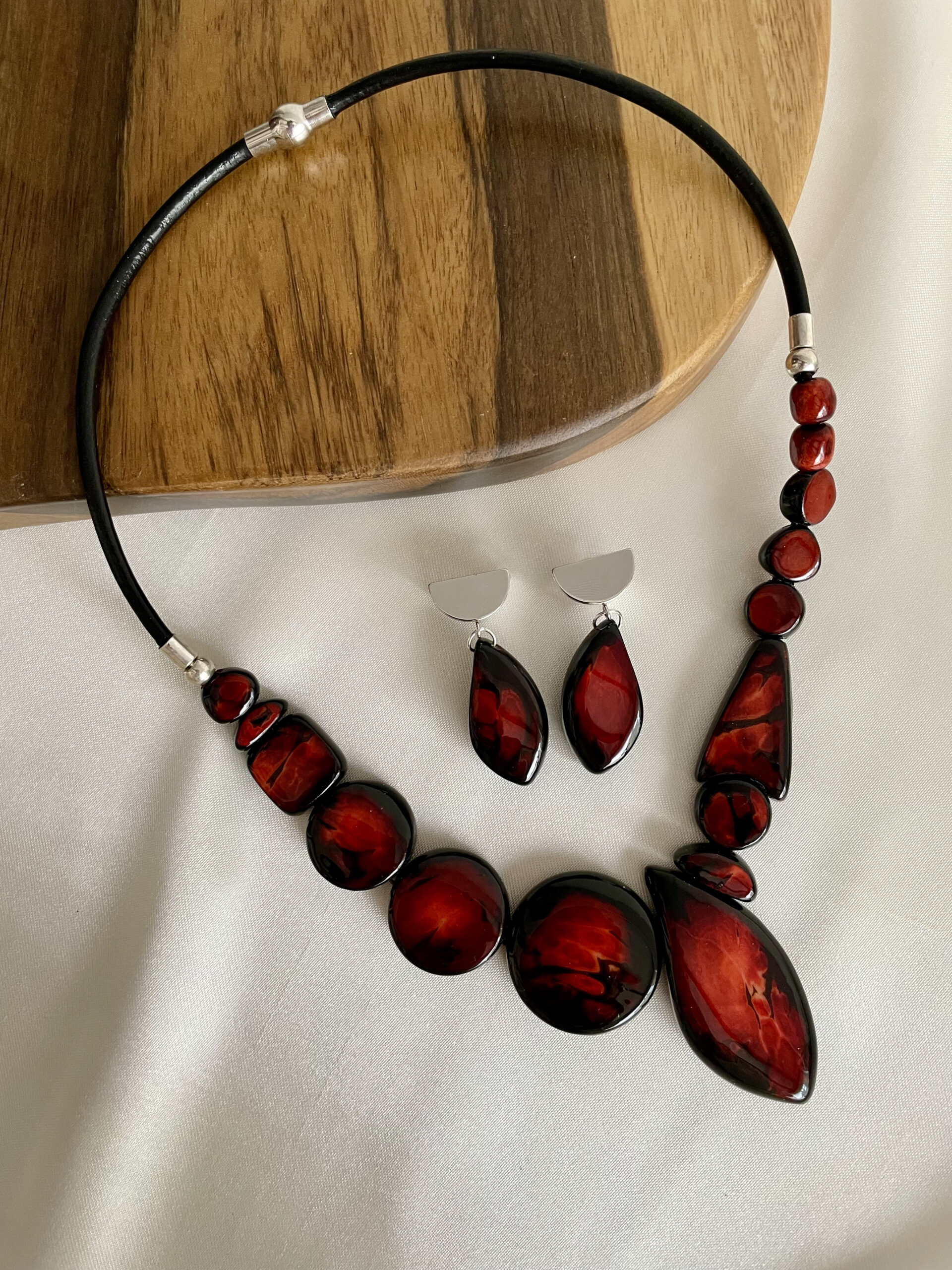 Tagua necklace, coated with resin for a glossy finish and greater protection of the tagua. Pre-selected tagua, leather, and magnetic steel clasp. Approximate size: 22 cm long.