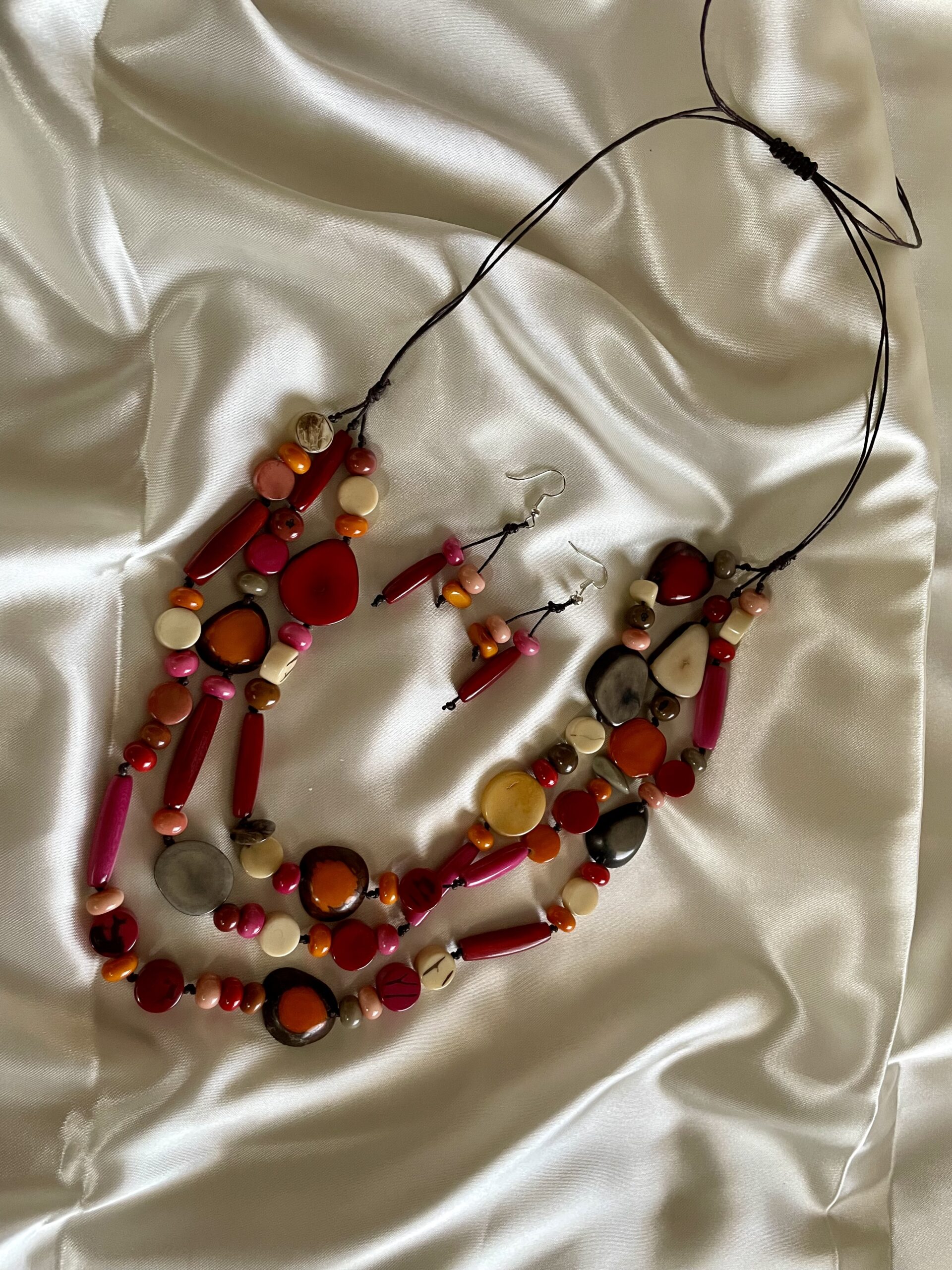 Collar de Tagua con cordón de hilo encerado para bisutería. Medida aproximada y ajustable: 35cm de largo, aretes 6,5cm de largo.