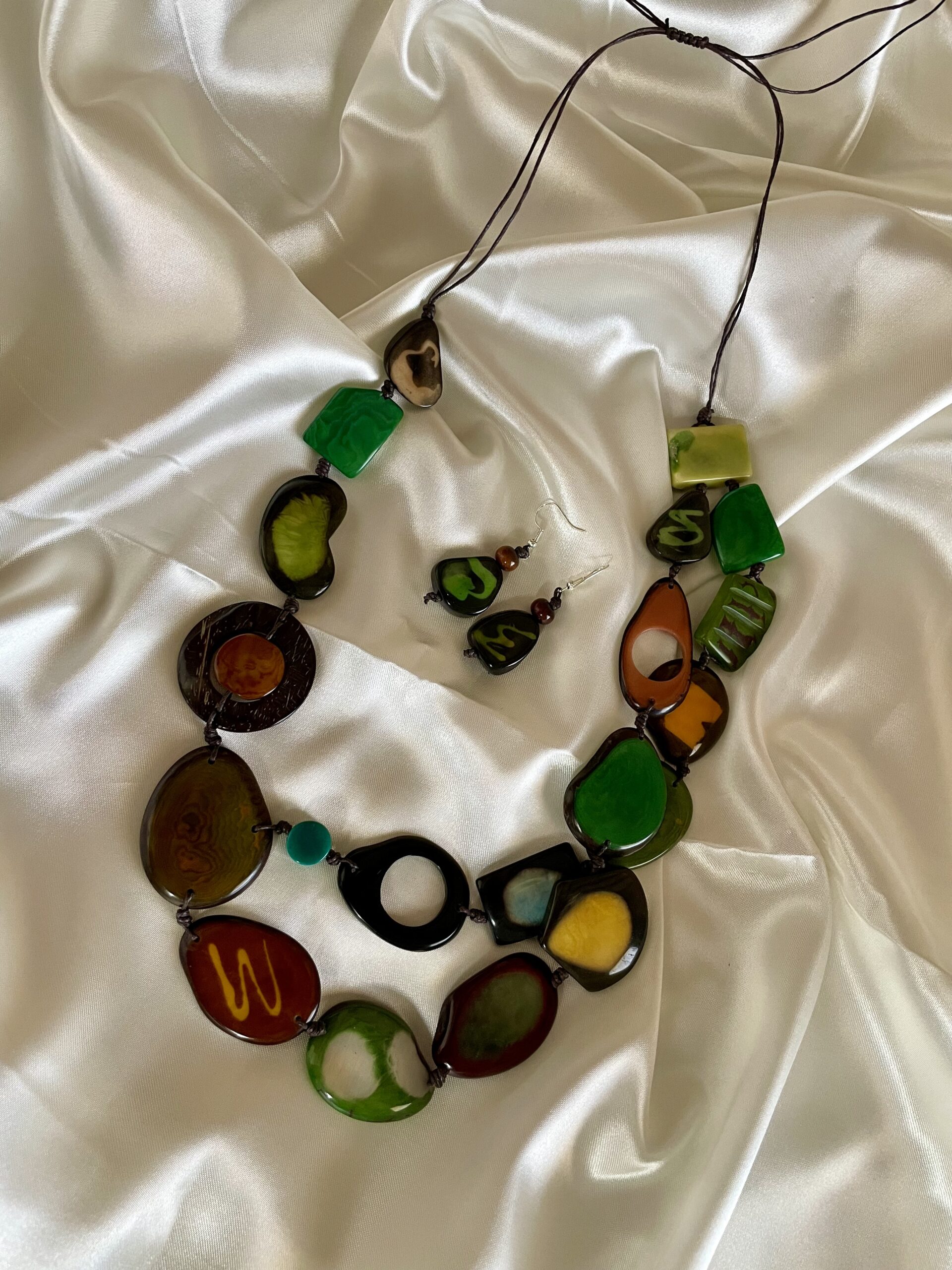 Collar de Tagua con cordón de hilo encerado para bisutería. Medida aproximada y ajustable: 36cm de largo, aretes 5,5cm de largo.