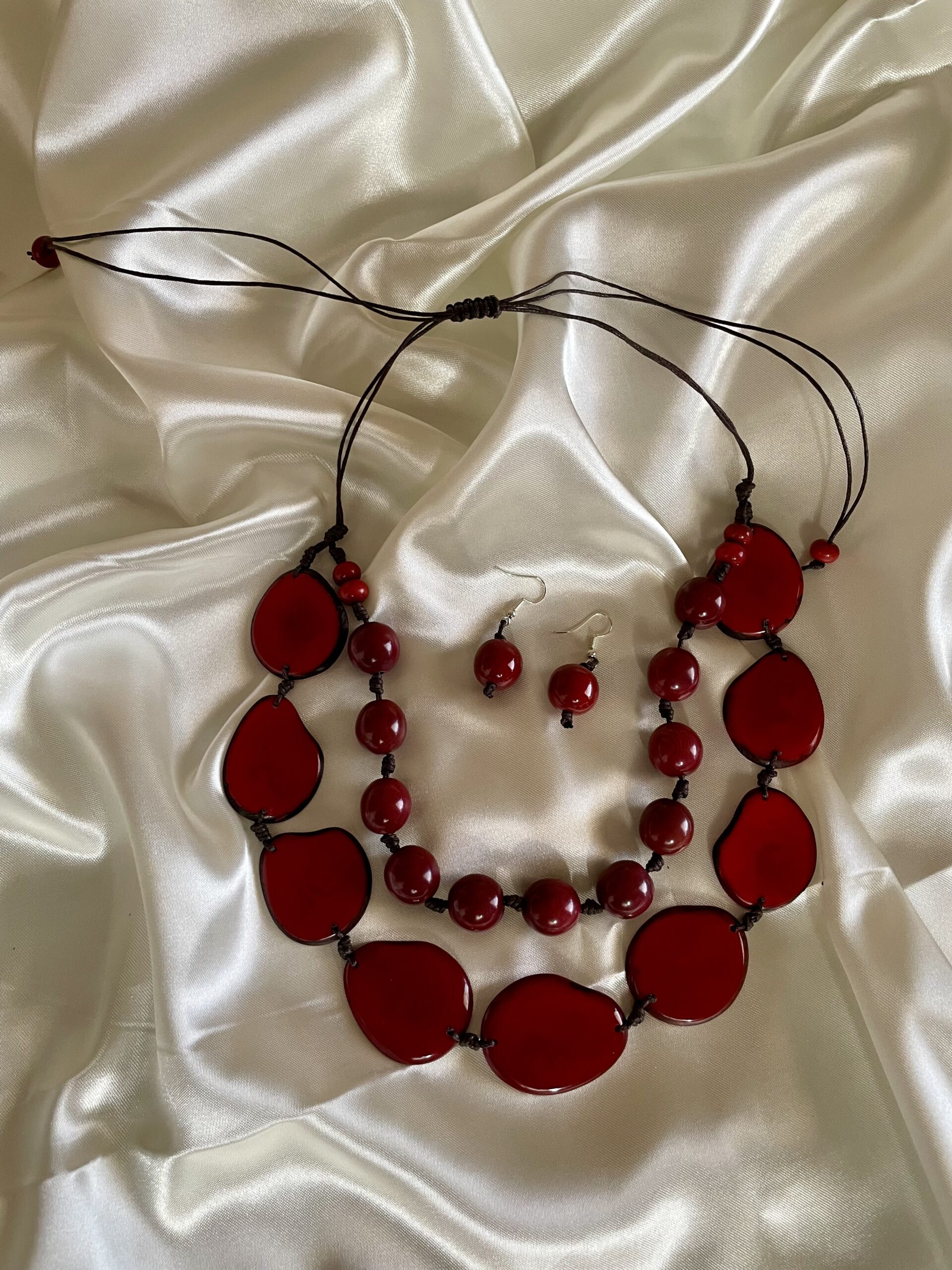 Collar de Tagua con cordón de hilo encerado para bisutería. Medida aproximada y ajustable: 30cm de largo, aretes 4cm de largo.