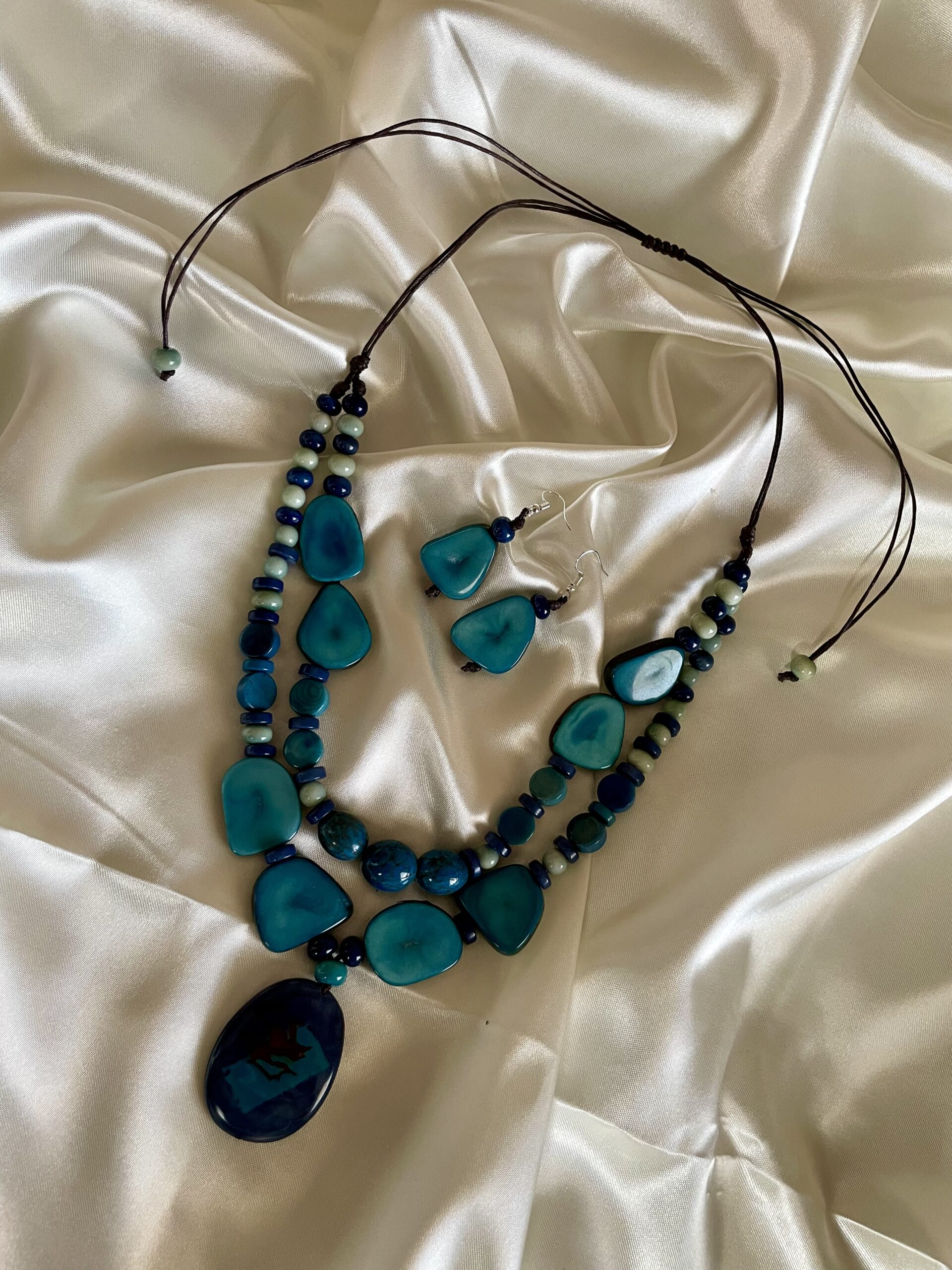 Collar de Tagua con cordón de hilo encerado para bisutería. Medida aproximada y ajustable: 32cm de largo, aretes 5,5cm de largo.