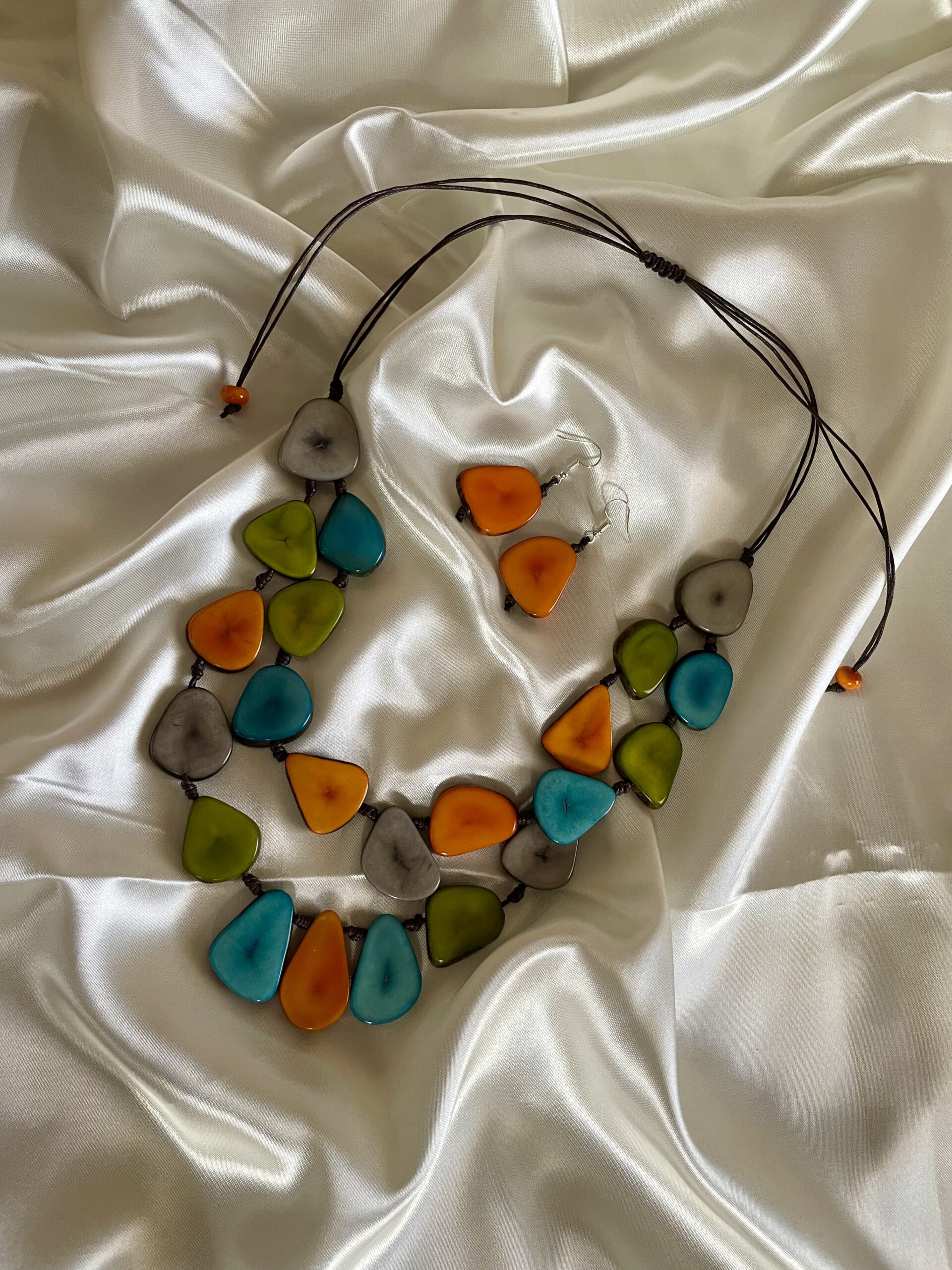 Collar de Tagua con cordón de hilo encerado para bisutería. Medida aproximada y ajustable: 33cm de largo, aretes 6cm de largo.